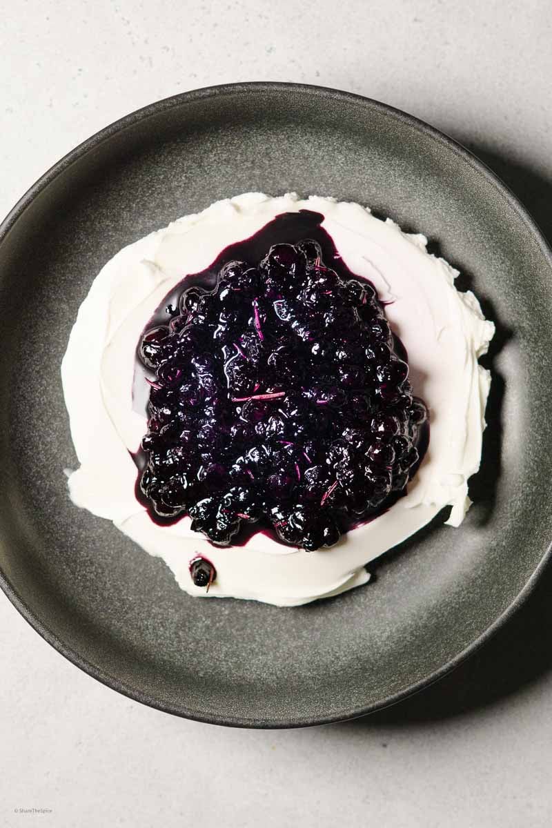 - Remove the cream cheese from the package onto the serving plate. Pour the blueberry mixture over the cream cheese mixture.